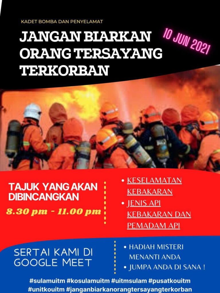 🚒Kami pelajar dari kor KOMPENI KADET BOMBA UiTM CAWANGAN JOHOR, KAMPUS SEGAMAT 👩🚒kelas JHBU133A akan mengadakan program komuniti secara atas talian yang bertajuk: